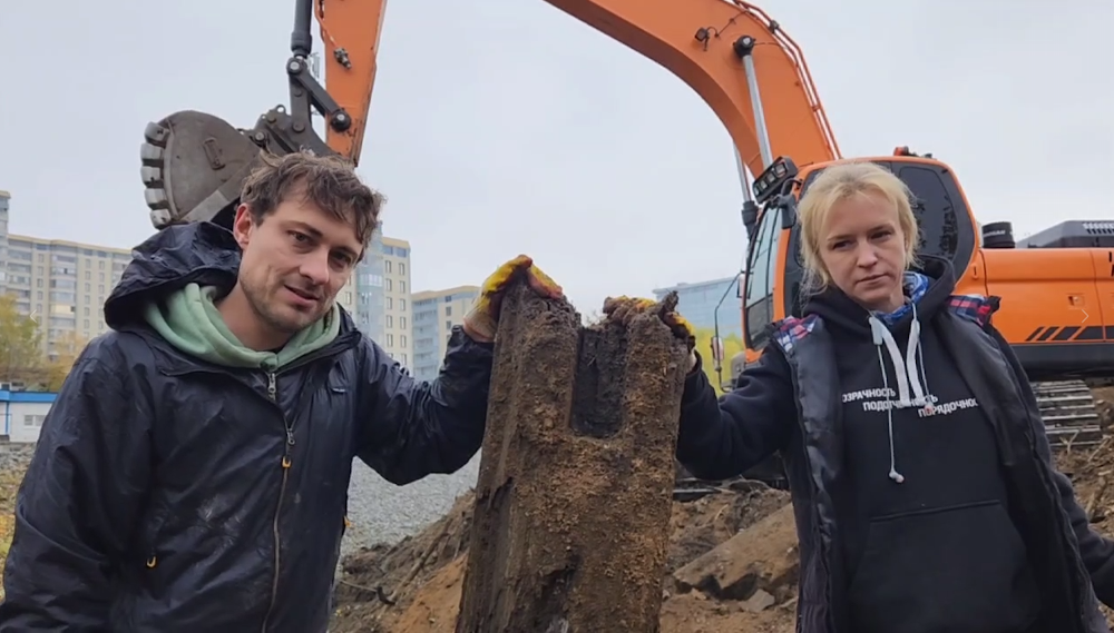 Активисты движения "Мирные жители" Алексей Кофман и Екатерина Лахтикова демонстрируют старинную конструкцию, выявленную в ходе земляных работ за Царским мостом. Фото: telegram-канал "Сад Нурова"