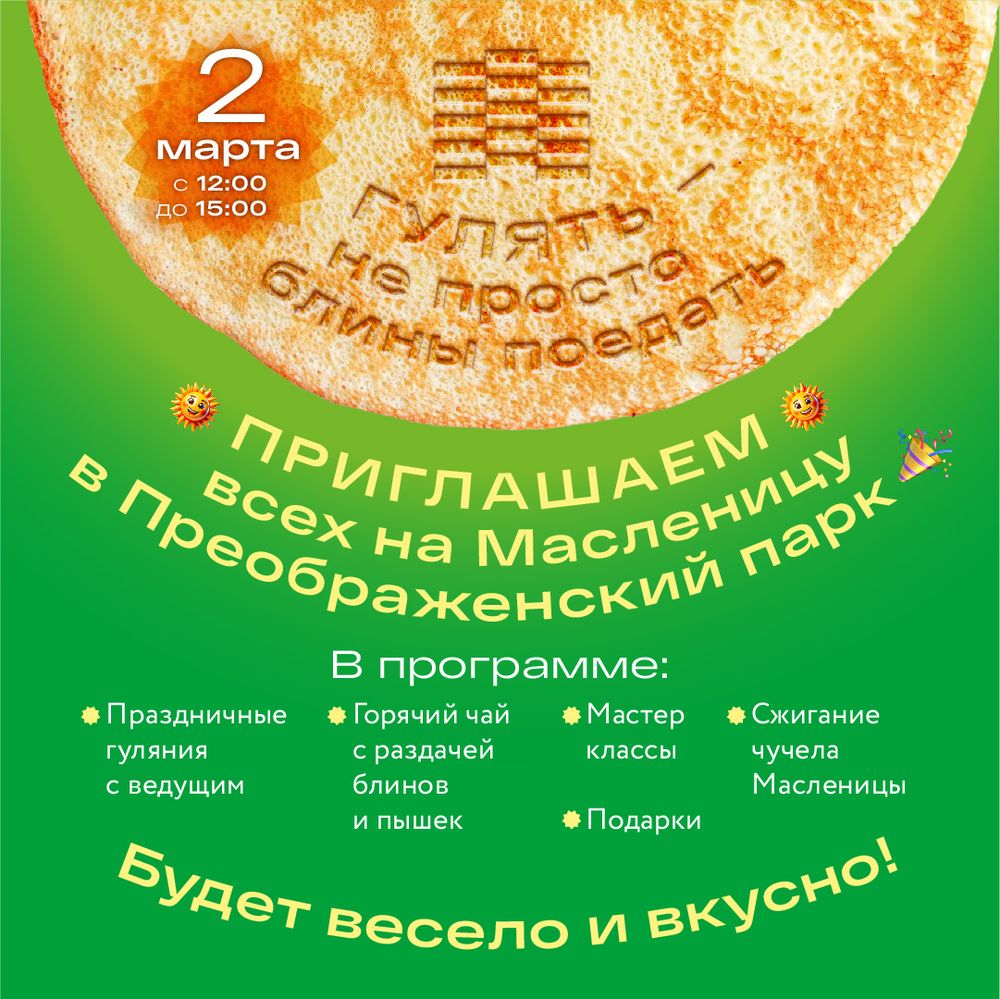 В Академическом районе Екатеринбурга 2 марта будет шумно и весело. В Преображенском парке в полдень развернется празднование Широкой Масленицы. Гостей ждут более 40 станций с народными забавами, веселыми состязаниями, мастер-классами и, конечно, ароматными блинами.