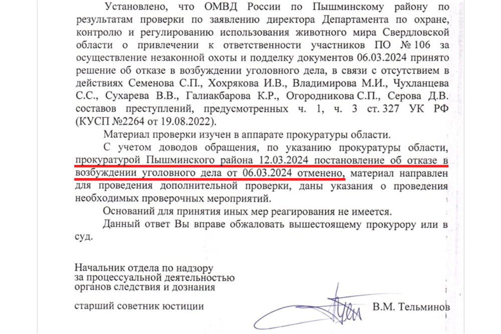 За 2021-2023 годы сотрудники ОМВД России "Пышминский" 7 (!) раз выносили постановление об отказе в возбуждении, которые затем как незаконные отменялись прокуратурой и судом. Департамент по охране животного мира Свердловской области не может преодолеть сопротивления силовиков. А может ли быть иначе, если речь идет о фактах браконьерства, в которых замешаны люди с известными фамилиями?