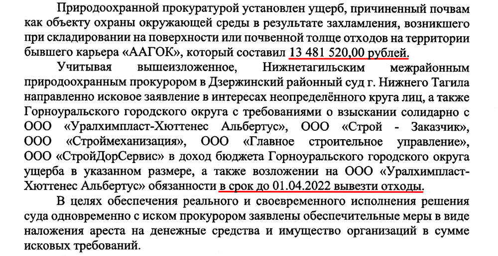 А пока что, благодаря настойчивости жителей Новоасбеста, а также журналистов "Реального Тагила" и "Уралинформбюро", до суда доведены все участники вышеуказанной цепочки. Прокуратура Свердловской области сообщила нам о том, что с них солидарно будут взыскивать 13,5 миллиона рублей за ущерб, нанесенный почвам карьера. Более того, надзорный орган требует от ООО "Уралхимпласт – Хюттенес Альбертус" вывезти незаконно размещенные отходы до 1 апреля 2022 года.