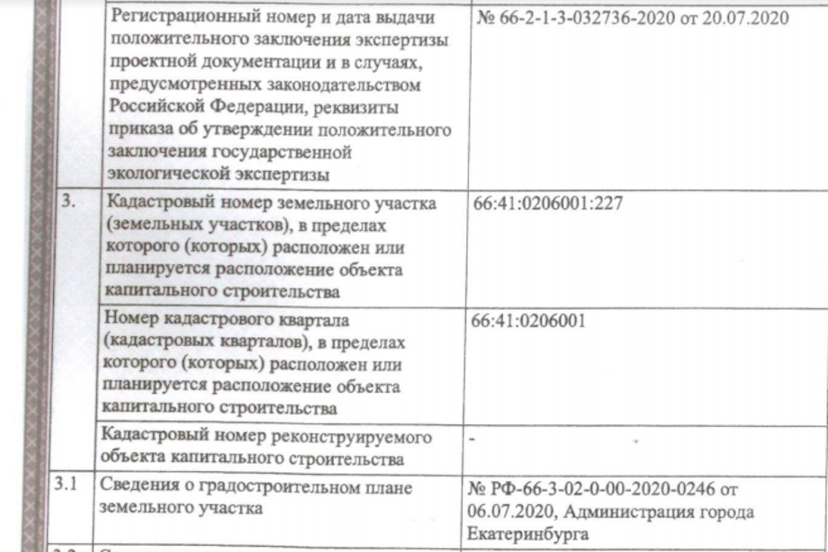 Кроме этого договора есть разрешение на строительство от 11 августа 2020 года, выданное "Бруснике" областным Минстроем. В нем "под объект капитального строительства" выделяется участок под номером 66:41:0206001:227 - ныне не существующий, поскольку после межевания был разделен на три новообразованных.