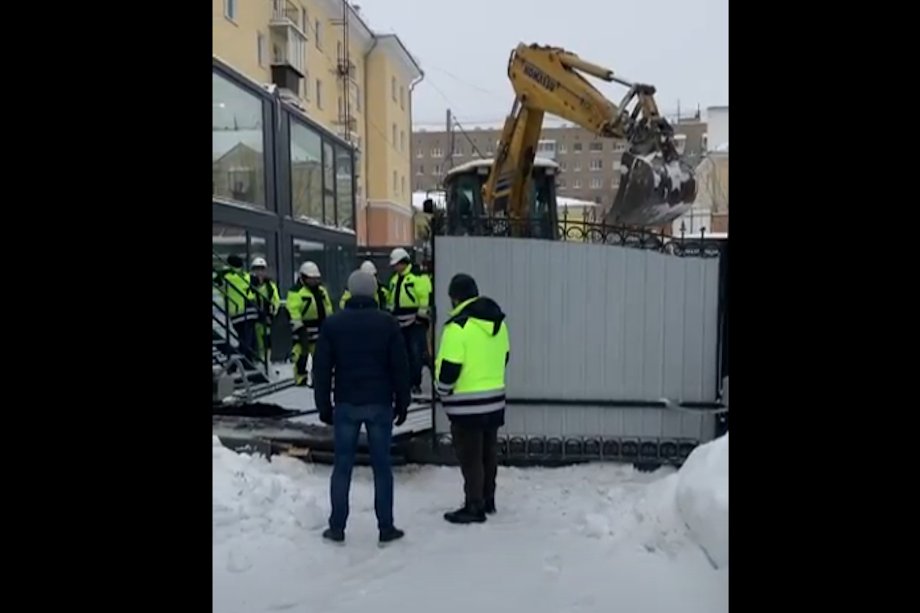 Демонтаж ворот, отделяющих стройплощадку "Брусники" от владений гаражного кооператива. Скриншот: видео Сергея Луппова.
