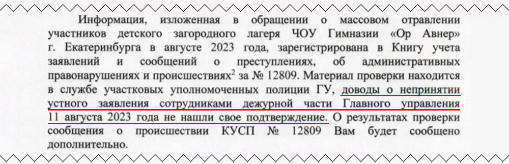 В этом скандале умудрилось "отличиться" и ГУ МВД по Свердловской области. Родители отравившихся детей в августе буквально не знали, куда обратиться за подмогой. Лагерь распустили в выходные. Управление Роспотребнадзора не работало, одна из родительниц позвонила в дежурную часть полицейского главка. Там нам сейчас признались, что это обращение поступило, но четыре (!) месяца по нему не было никаких процессуальных действий.