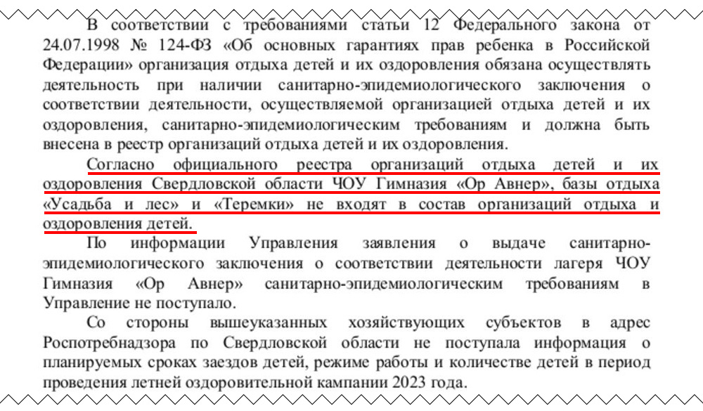 Свердловское управление Роспотребнадзора после обращения "Уралинформбюро" всячески пыталось отбояриться от проверки вскрывшегося факта. Пришлось побеспокоить их федеральное руководство. Накануне в редакцию пришел ответ – "факты, подтверждающие осуществление отдыха и оздоровления детей ЧОУ Гимназия "Ор Авнер" на территории баз отдыха "Усадьба и лес" и "Теремки"… отсутствуют". Что было подтверждено совместной проверкой Роспотребнадзора и прокуратуры 19 декабря.