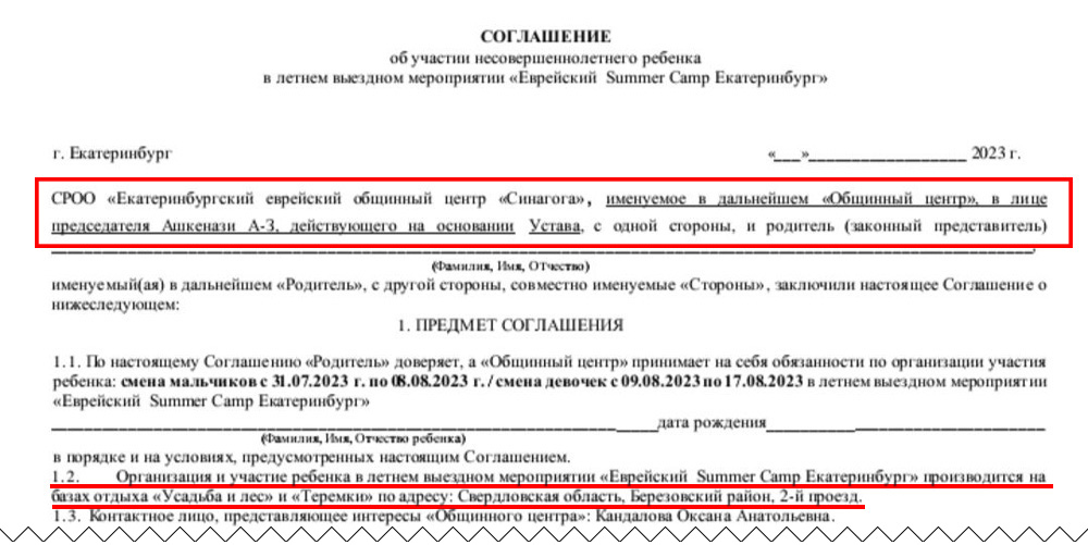 Во-вторых, эти базы не приспособлены для проведения подобного рода лагерей. Они не могут накормить две сотни сорванцов, тем более с соблюдением религиозных требований. В Соглашении, которое раввин Ашкенази подписывал с родителями, организаторы "Еврейского Summer Camp Екатеринбург" обязались предоставить пятиразовое питание, соответствующее законам Кашрута. И, кроме того, обеспечить контроль за отдыхом и здоровьем детей согласно нормативам СанПиН.