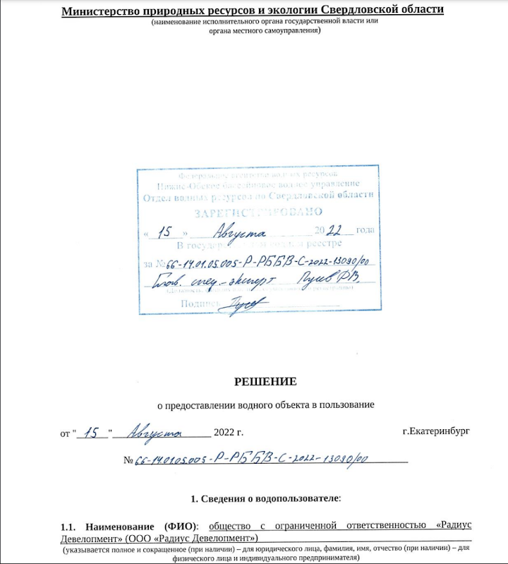 Именно Минприроды в августе 2022 года приняло решение предоставить "водный объект" в пользование "Радиусу" (документ имеется в распоряжении редакции). Решение, заверенное печатью и подписью замминистра Антона Сафронова – "шедевр" взаимоисключающих параграфов, а местами и недостоверной информации.
