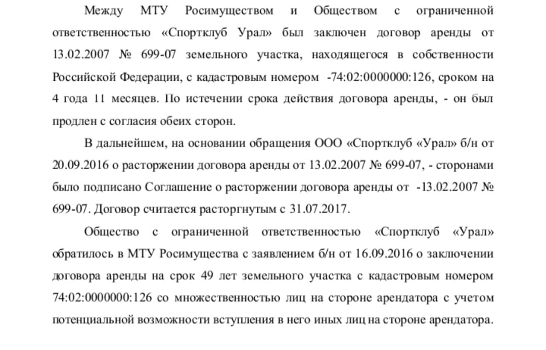 Представитель собственника земли – теруправление Росимущества глазом не моргнуло на переуступку права аренды на 49 лет жене олигарха. А кто-то поинтересовался – корпус какого санатория находится в ее собственности? В "спортивном" корпусе право аренды за ООО "Спортклуб "Урал" было прекращено, а затем оно возникло у собственников выкупленных апартаментов. И до сих пор теруправление не может заключить договоры аренды со всеми!