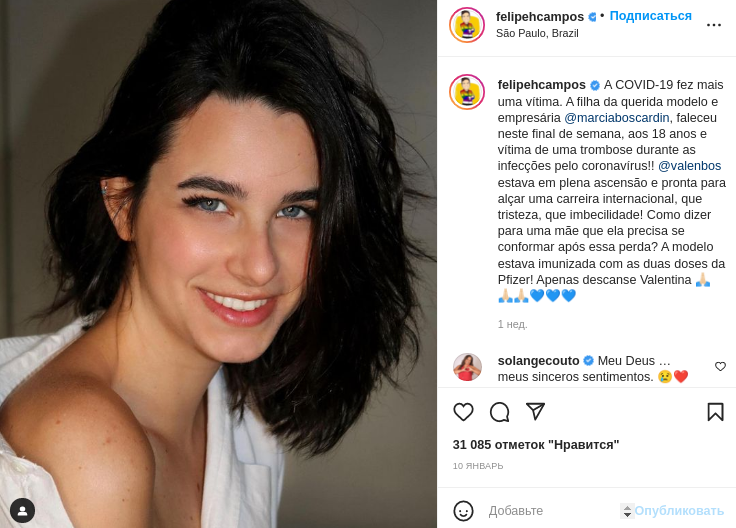 Буквально накануне появилось сообщение о смерти 18-летней совершенно здоровой бразильской модели от тромботических осложнений, вызванных ковидом. Девушка поступила в стационар 6 января и умерла 9 января.