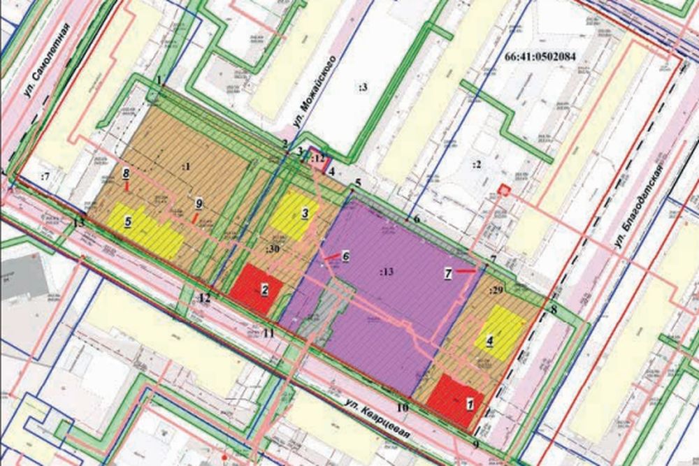 Территория КРТ на улице Кварцевой. Красным обозначены аварийные дома, желтым - "соответствующие критериям", фиолетовым - участок в муниципальной собственности. Схема: екатеринбург.рф