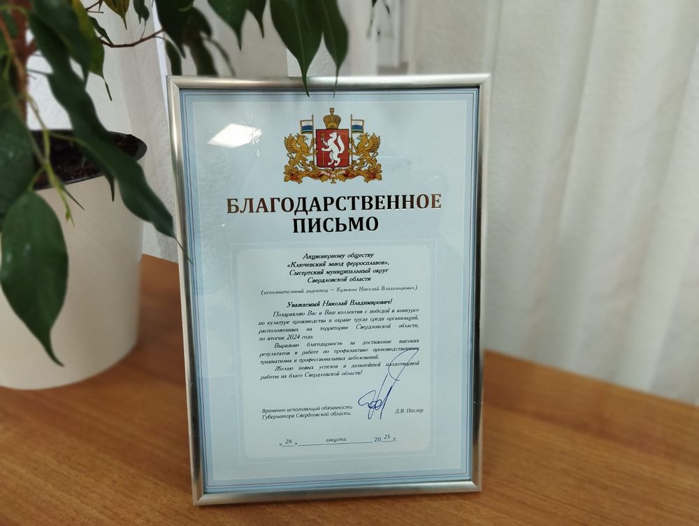 "Получение благодарственного письма от губернатора подтверждает, что наши усилия по созданию безопасных условий труда и повышению производственной культуры не остаются незамеченными", – отметил исполнительный директор Ключевского завода ферросплавов.