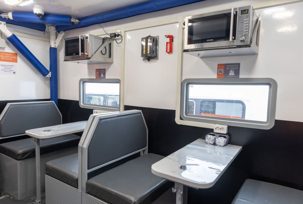 Передвижные столовые представляют собой фургоны на базе "Урала" с инфраструктурой для разогрева и приема пищи. Внутри расположена полностью оборудованная обеденная зона, где в любую погоду с помощью систем отопления и кондиционирования поддерживается комфортный микроклимат.