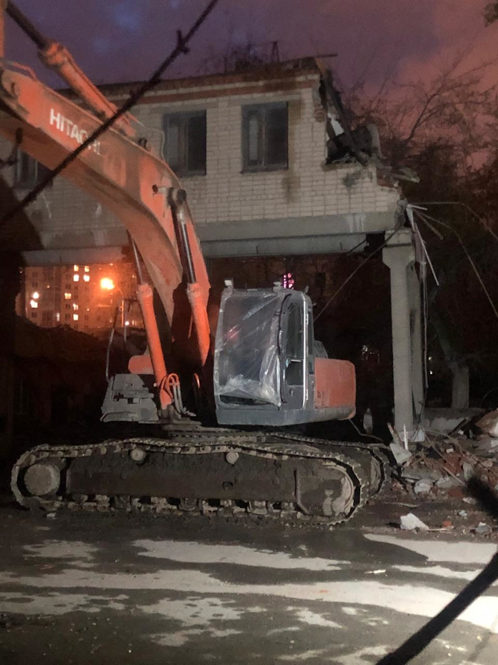 В компании "ДорСтройИнвест", которая выступает подрядчиком на сносе дома, информацию о повреждении экскаватора не подтвердили.