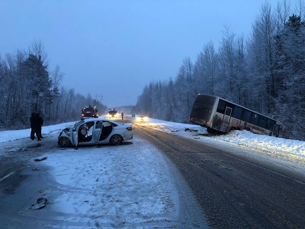 По предварительным данным, около семи часов утра 35-летний водитель автобуса КАвЗ не справился с управлением и допустил занос, после чего машина выехала на полосу встречного движения, где произошло столкновение с Lada Vesta под управлением 29-летнего мужчины. От удара у легковушки разворотило моторный отсек, а автобус отбросило в кювет.