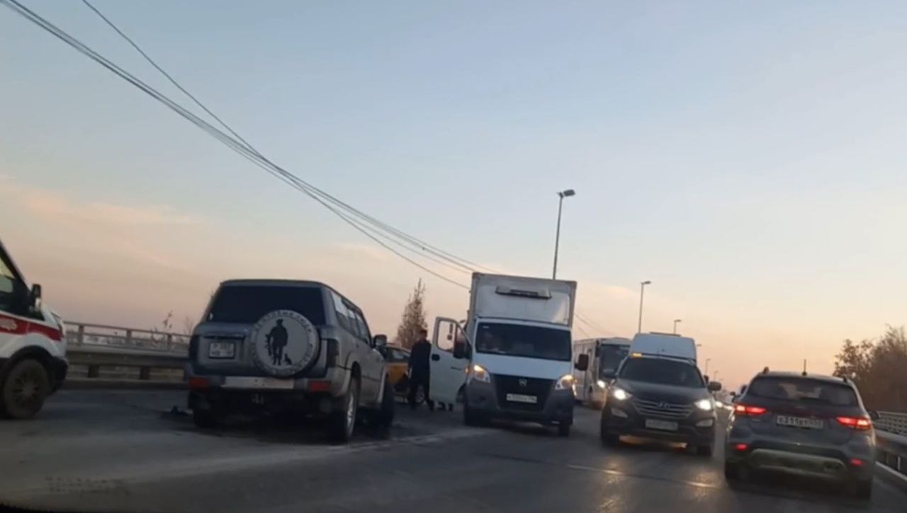 В Екатеринбурге утром 22 октября на автомобильном мосту на улице Блюхера собралась огромная пробка. Причиной стала авария, в которой пострадали четыре машины, включая "Газель" и такси.