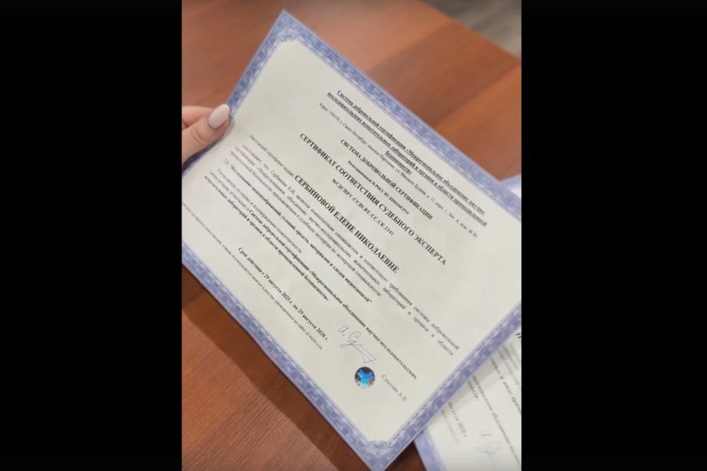 Сербинова пояснила, что осенью начала искать информацию о специалистах, проводивших исследование места трагедии. Единственный документ, подтверждающий их компетентность, кроме дипломов о высшем образовании, – сертификат соответствия судебного эксперта, выданный организацией из Санкт-Петербурга.