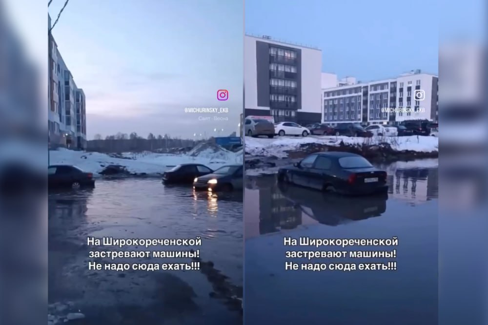 Тем временем на соседней улице Широкореченской начался натуральный потоп: проезжую часть затопило талыми водами, машины не могут проехать.