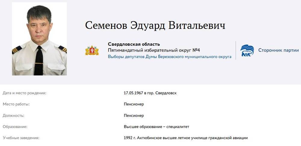 На праймериз единороссов 58-летний летчик выдвинулся в пятимандатном округе № 4 как сторонник партии. В его анкете указано, что он пенсионер.