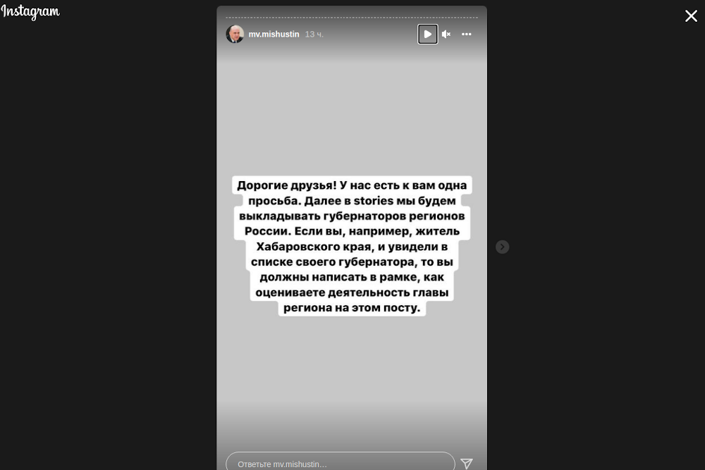 "Дорогие друзья! У нас есть к вам одна просьба. Далее в stories мы будем выкладывать губернаторов регионов России. Если вы, например, житель Хабаровского края, и увидели в списке своего губернатора, то вы должны написать в рамке, как оцениваете деятельность главы региона на этом посту", – гласит анонс опроса.
