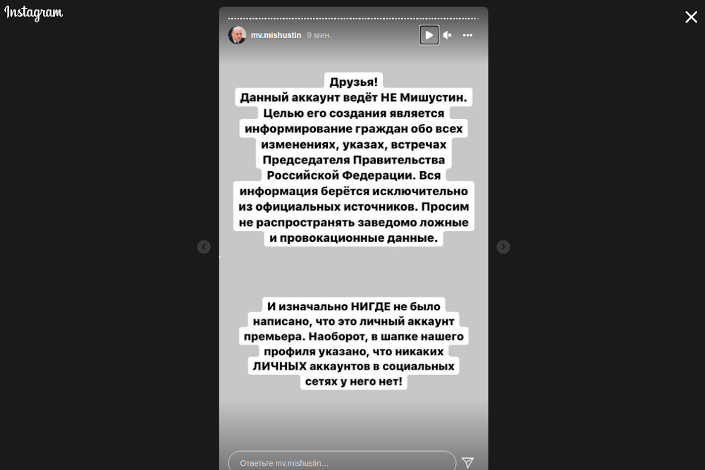 Позже в самом аккаунте появилось сообщение о том, что он не связан напрямую с председателем правительства: "Данный аккаунт ведет не Мишустин. Целью его создания является информирование граждан обо всех изменениях, указах, встречах председателя правительства Российской Федерации. (…) Изначально нигде не было написано, что это личный аккаунт премьера".