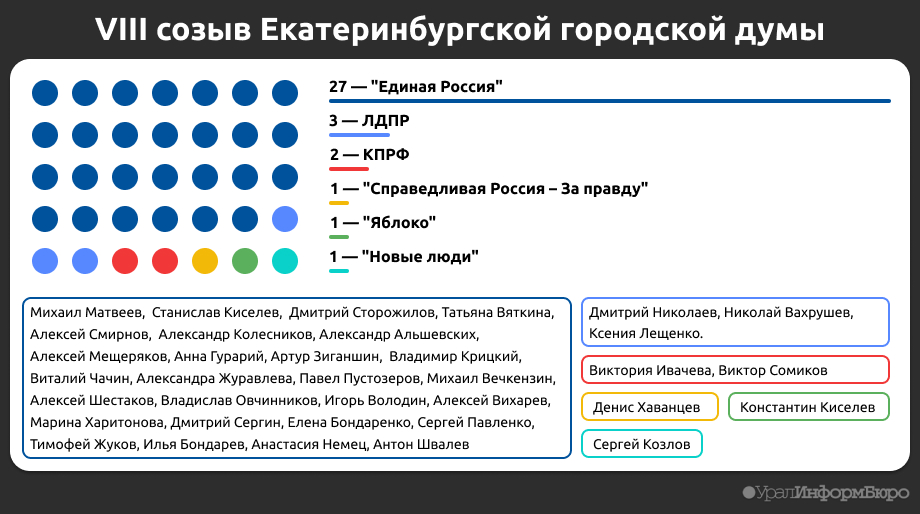 Таким образом, в восьмом созыве думы Екатеринбурга будут работать 27 представителей "Единой России": 23 победителя в одномандатных округах (Михаил Матвеев, Станислав Киселев, Дмитрий Сторожилов, Татьяна Вяткина, Алексей Смирнов, Александр Колесников, Алексей Мещеряков, Александр Альшевских, Анна Гурарий, Артур Зиганшин, Владимир Крицкий, Виталий Чачин, Александра Журавлева, Павел Пустозеров, Михаил Вечкензин, Алексей Шестаков, Владислав Овчинников, Игорь Володин, Алексей Вихарев, Марина Харитонова, Дмитрий Сергин, Елена Бондаренко и Сергей Павленко) и четыре "списочника" (Тимофей Жуков, Илья Бондарев, Анастасия Немец и Антон Швалев).