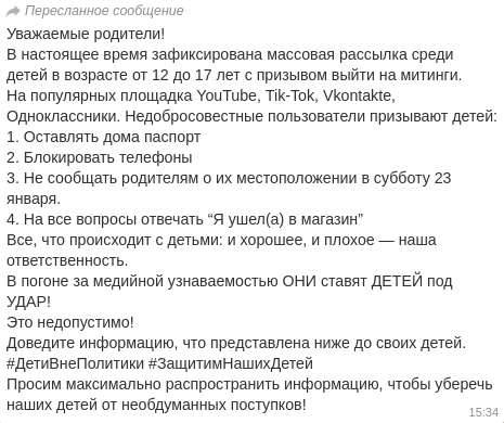 О том, что в учебные заведения якобы поступило "распоряжение" обеспечить занятость учащихся с 12:00 до 16:00 23 января, в соцсетях сообщила учитель физики СОШ № 185 в Екатеринбурге Ирина Скачкова. По ее словам, учителей попросили провести с детьми беседу о недопустимости участия в несанкционированном митинге и о том, какие санкции грозят нарушителям.