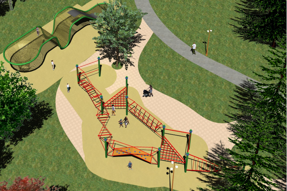 Вторая концепция предусматривает разбивку парковой территории на две подзоны: урбанизированную и природную. В первой предлагается установить универсальную спортивную площадку, зону воркаута и уличных тренажеров, площадки для игр детей.