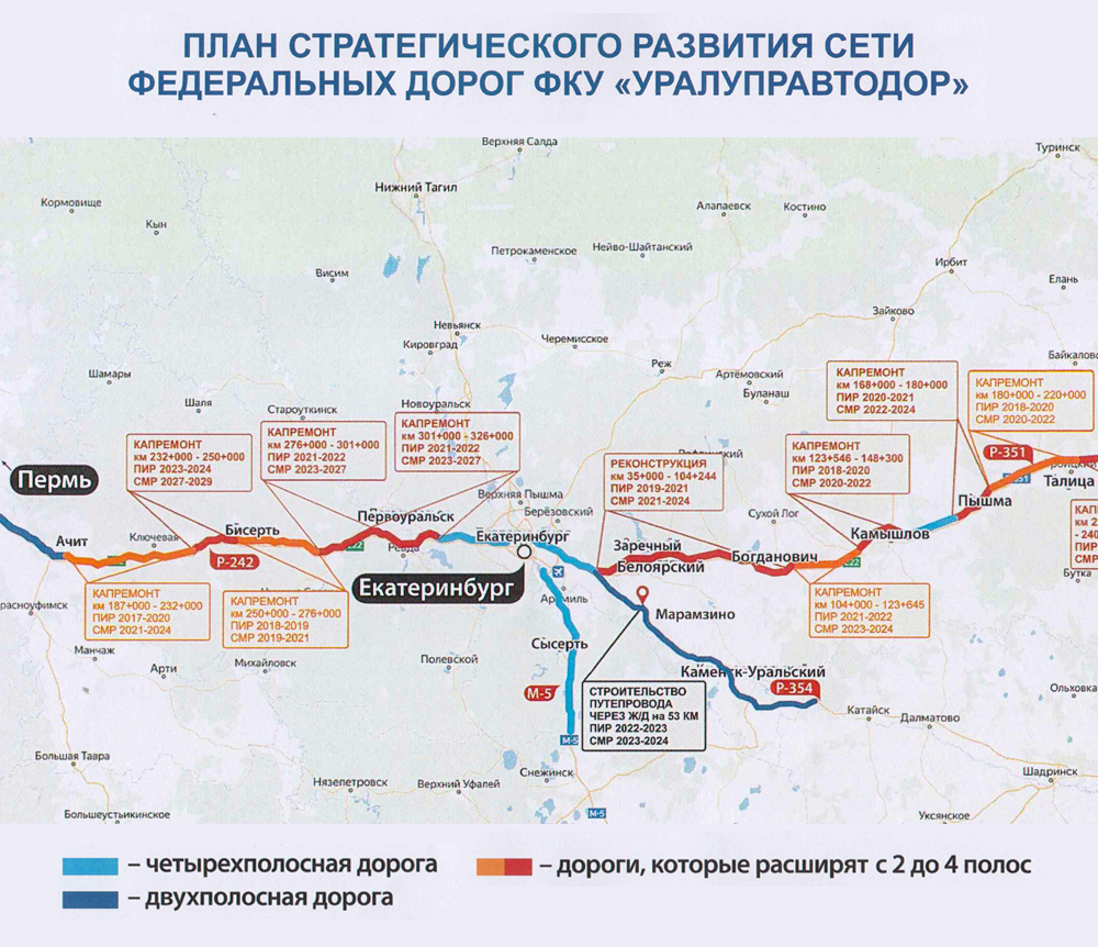 В ближайшие годы дорожные строители планируют расширение дорог на двух других направлениях в Свердловской области. На Пермском тракте капитальный ремонт запланирован на участках 187-232 километр и 250-276 километр. На тюменском направлении планируют капитальный ремонт на участках 123-148, 180-220, 220-240, еще несколько отрезков находятся на этапе проектирования.