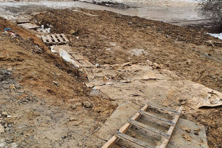 Слякотное "море" хранит в себе много разнообразного мусора: куски картона, фрагменты деревянных настилов (как оказалось, это останки импровизированных "мостков" для более-менее безопасного передвижения) и даже секции труб.
