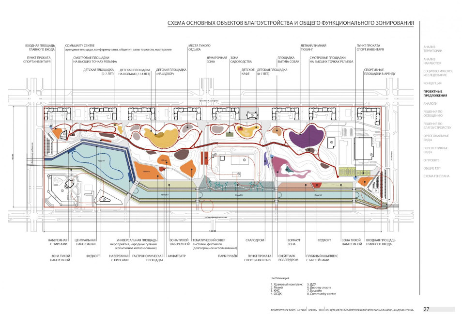 По словам Тамары Благодатковой, в Аллеях предлагается разместить три функциональных зоны: пешеходного транзита, ожидания (для родителей, приведших своих детей на спортивные занятия) и развлечений, где предусмотрена установка детского игрового оборудования.