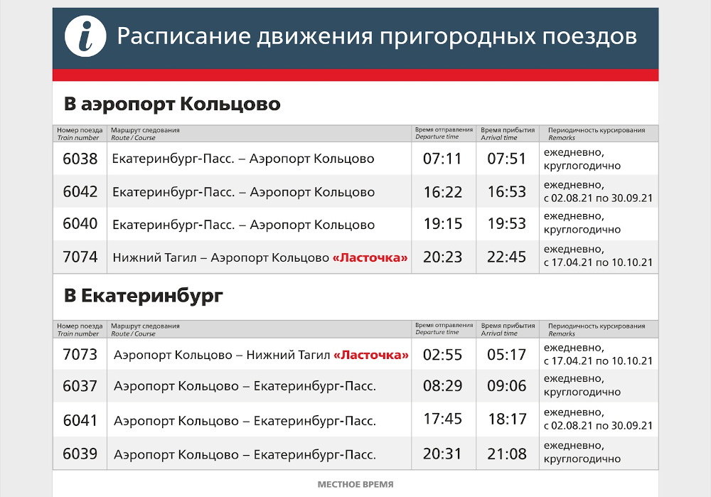 Сейчас пригородные поезда до аэропорта отправляются со станции Екатеринбург-Пассажирский в 07.11, 19.15 и 22.21 (электропоезд "Ласточка"). Обратные рейсы – в 02.55 ("Ласточка"), 08.29 и 20.31. Стоимость проезда – 64 рубля, на "Ласточке" – 130 рублей.