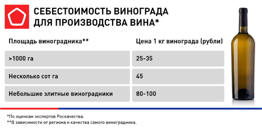 Себестоимость килограмма винограда на площади свыше 1 тысячи гектаров (в зависимости от региона и качества виноградника), по оценкам экспертов Роскачества, сейчас составляет 25-35 рублей за килограмм. На винограднике в несколько сотен гектаров - более 45 рублей. И на небольших элитных виноградниках - более 80-100 рублей.