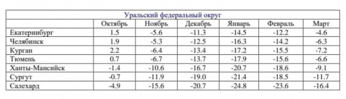 Средние многолетние значения температуры воздуха по административным центрам регионов УрФО