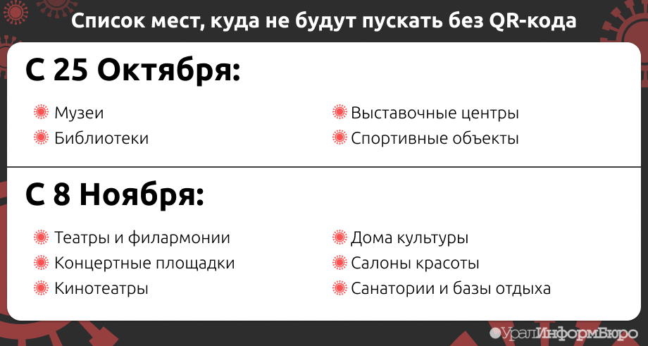 В последнюю неделю октября без QR-кода нельзя будет попасть в музеи, библиотеки, выставочные центры и на спортивные объекты. С 8 ноября систему допуска распространят на театры, филармонии, концертные площадки, кинотеатры, дома культуры, салоны красоты, санатории и базы отдыха. Предприятий общепита и фитнес-клубов ограничительные меры пока не коснутся.
