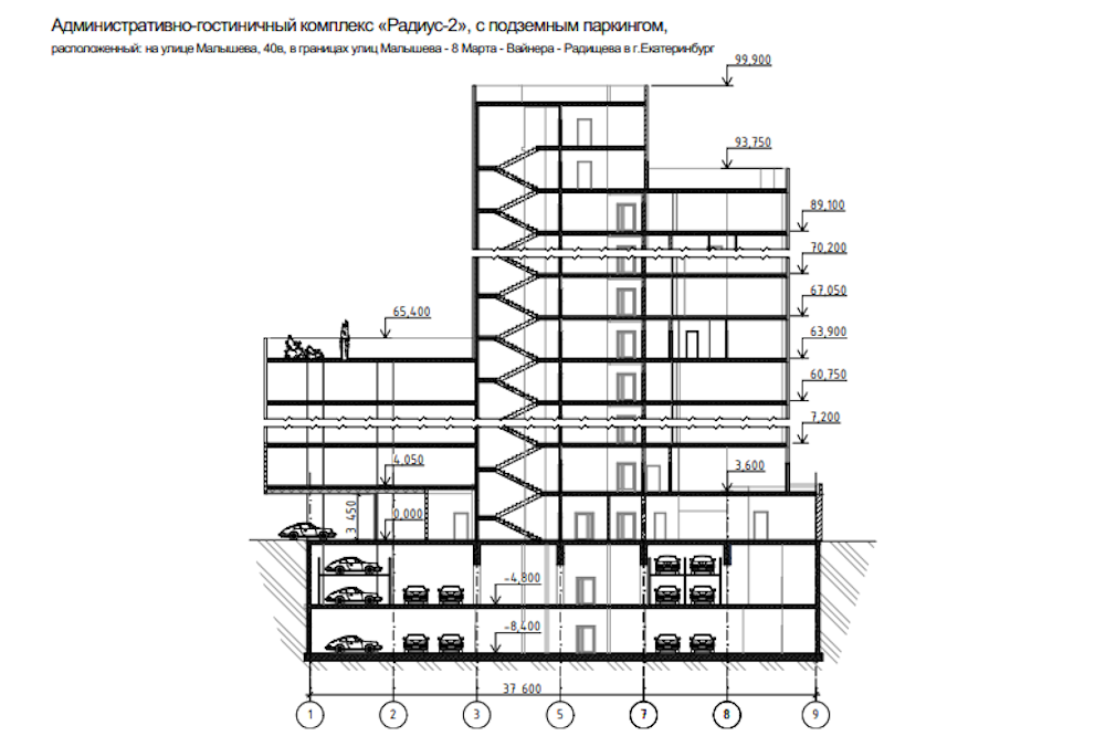 Стометровый гостиничный комплекс "Радиус-2" предполагается разместить на задворках памятника конструктивизма Дом контор (8 Марта, 10). План по его строительству 28 октября презентовал членам градсовета главный архитектор проектной фирмы "Востокпроект" Евгений Трубецков. В роли заказчика проекта комплекса выступила компания "Регент".