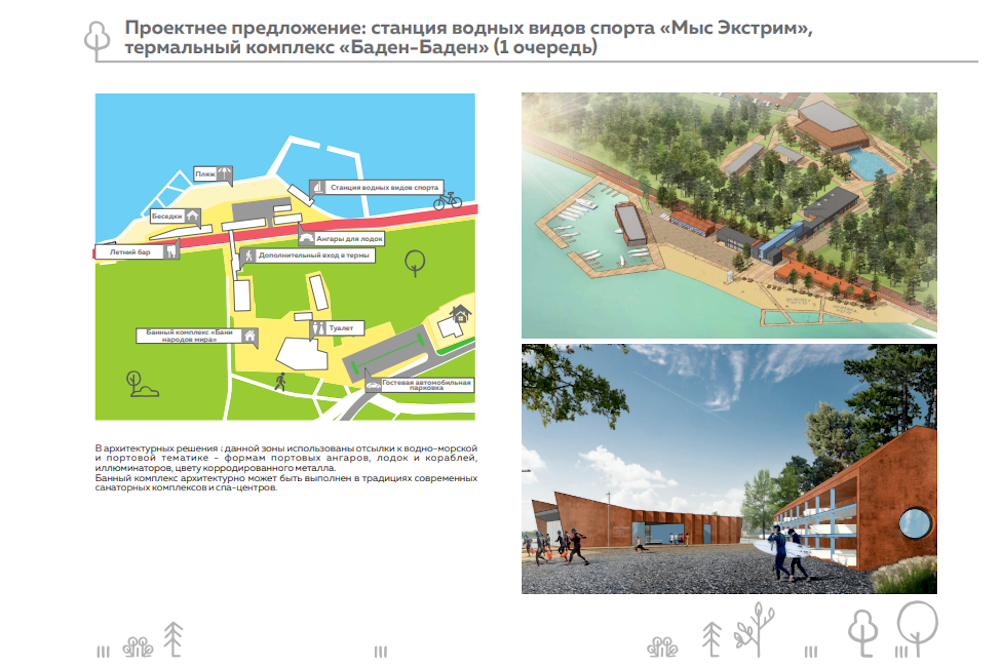 Согласно мастер-плану, на мысе предполагалось разместить станцию водных видов спорта с причалами и пляж на 70 человек, а "Баден-Баден" должен был разместиться южнее, на территории поселка Пески.