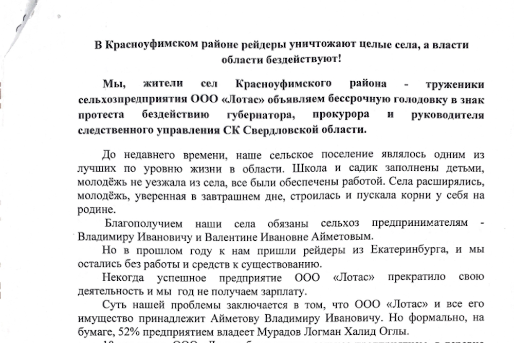 Работники сельскохозяйственного предприятия "ЛоТаС" в Красноуфимском районе 20 января объявили голодовку. Письмо с изложением требований сотрудников, поступившее в редакцию "Уралинформбюро", подписали свыше 30 человек.