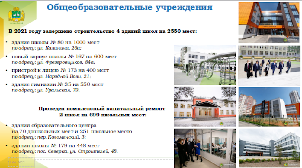 Кроме того, еще две школы в ходе капитальной реконструкции получат новые вместительные корпуса. Среди них гимназия № 120 (Степана Разина, 71, срок завершения работ – 2022 год) и гимназия № 40 (Мичурина, 181, сдача в 2024 году). Также текущим летом планируется начать реконструкцию школы № 41 в Верх-Исетском районе в рамках концессионного соглашения.