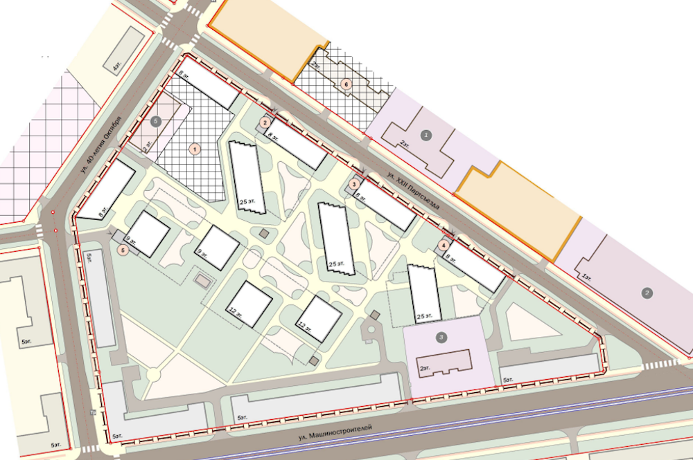 Проект планировки и межевания указанного квартала (вынесен на обсуждение практически одновременно с проектом поправок в Правила землепользования и застройки) предусматривает строительство на данной территории 12 многоквартирных жилых домов различной высотности (от 8 до 25 этажей) с подземными паркингами в общей сложности на 266 машин и детским садом на 140 мест.