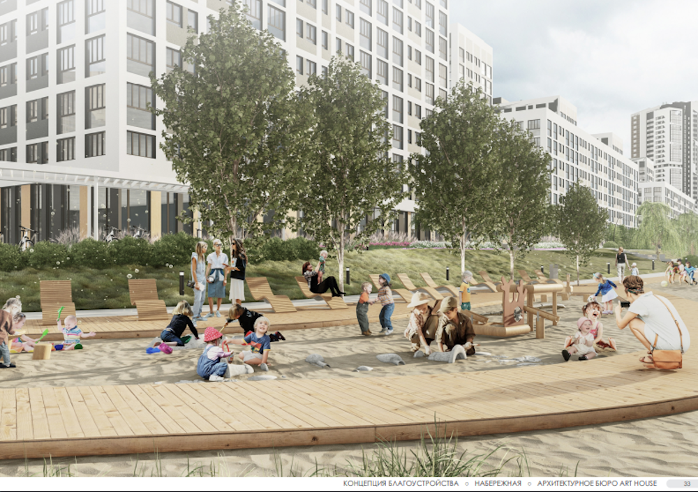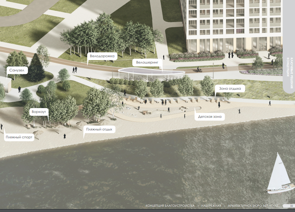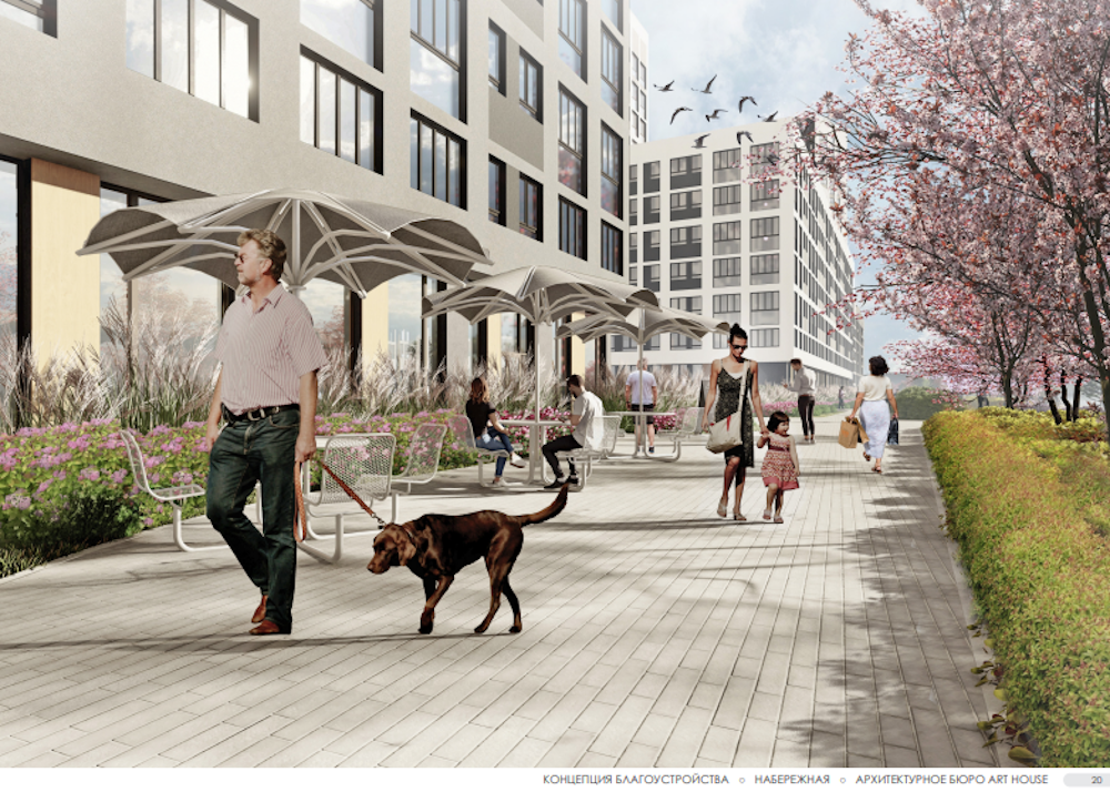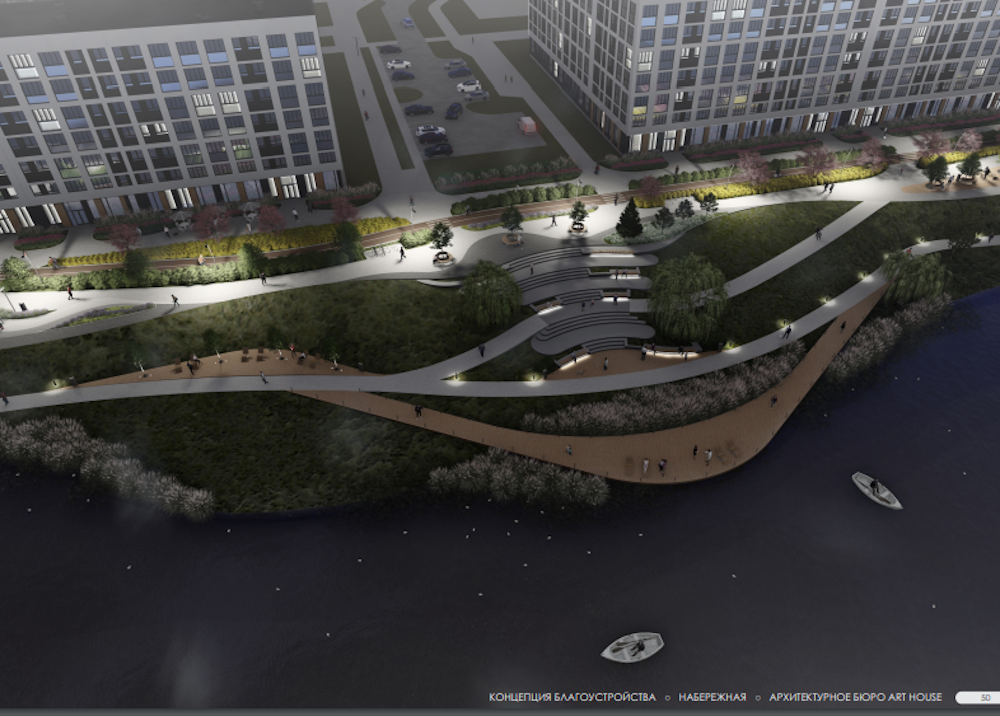 Согласно концепции Art House Studio, набережная будет состоять из двух ярусов: нижнего и верхнего. Нижний будет организован в виде прогулочного маршрута вдоль берега и оборудован пляжными зонами и пирсами для маломерных судов. Верхний ярус представляет из себя пешеходный и велотранзит, соотнесенный с существующей и проектируемой застройкой. По всей протяженности набережной установят освещение: в нижнем ярусе в виде столбиков-боллардов, в верхнем – больших фонарей.