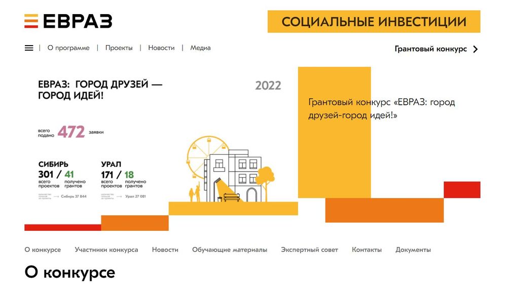 Один из ключевых элементов программы и эффективный инструмент развития местных сообществ – ежегодный грантовый конкурс "ЕВРАЗ: город друзей – город идей!", который проводится с 2007 года. На платформе представлен расширенный функционал для участников конкурса, размещены обучающие материалы, информация об участниках и победителях прошлых лет, а также членах экспертного совета.