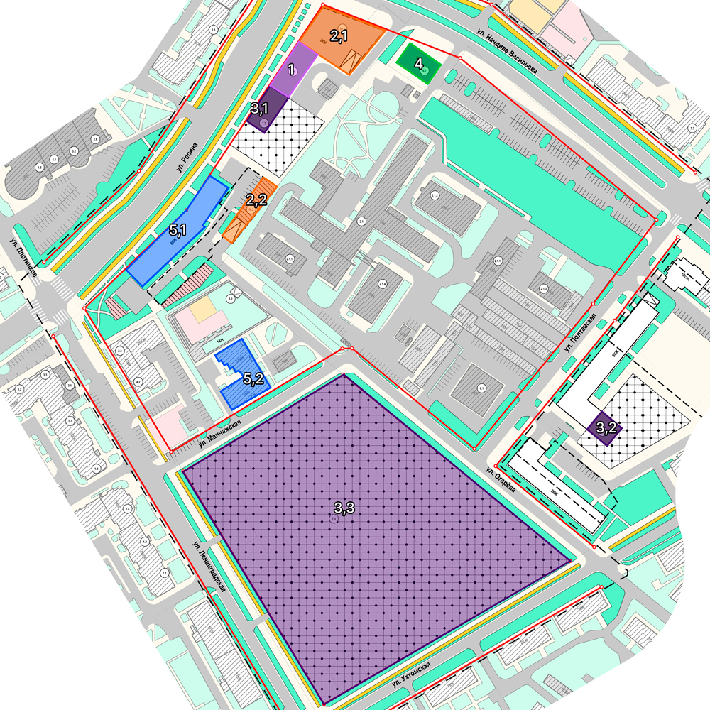 Обозначения: 1 розовый - фитнес-центр; 2 оранжевый - паркинги; 3 фиолетовый - 1,2 садики, 3 школа; 4 зеленый - лабораторно-диагностический комплекс; 5,1 проектируемый жилой дом и 5,2 ЖК "Прекрасный".