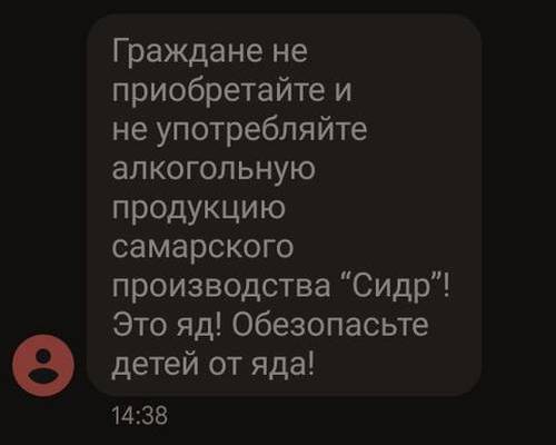 "Граждане, не приобретайте и не употребляйте алкогольную продукцию самарского производства "Сидр"! Это яд! Обезопасьте детей от яда!" – говорится в сообщении, автором которого значится РСЧС (Российская единая государственная система предупреждения и ликвидации чрезвычайных ситуаций).
