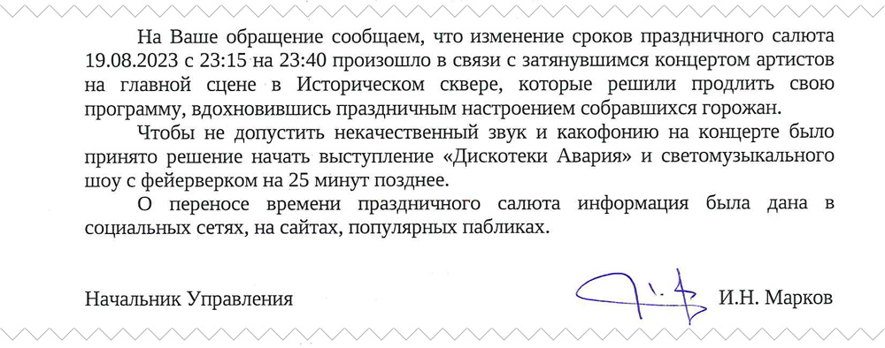 Начальник Управления Илья Марков сделал крайней "Дискотеку Аварию", что само по себе выглядит нонсесом. Именно его Управление отвечало за расписание субботнего концерта, которого были обязаны придерживаться приглашенные артисты. В нем изначально салют значился в 22.50. В крайнем случае, организаторы должны были сделать паузу в концерте, а затем продолжить его после фейерверка.