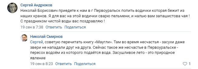 "Советую перечитать книгу "Маугли". Там во время несчастья – засухи – даже звери не нападали друг на друга. Сейчас такое же несчастье в Первоуральске – пересох водоем, из которого подается вода. Засушливое лето – это природное явление", – написал чиновник.