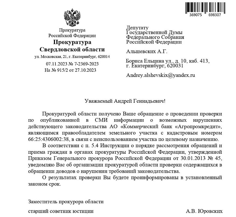 При этом, по мнению парламентария, поскольку участок "Агропромкредита" много лет фактически пустовал, Россельхознадзор должен был инициировать процедуру его изъятия. "Что не предпринял. Попросил прокуратуру оценить бездействие чиновников", – добавил депутат.