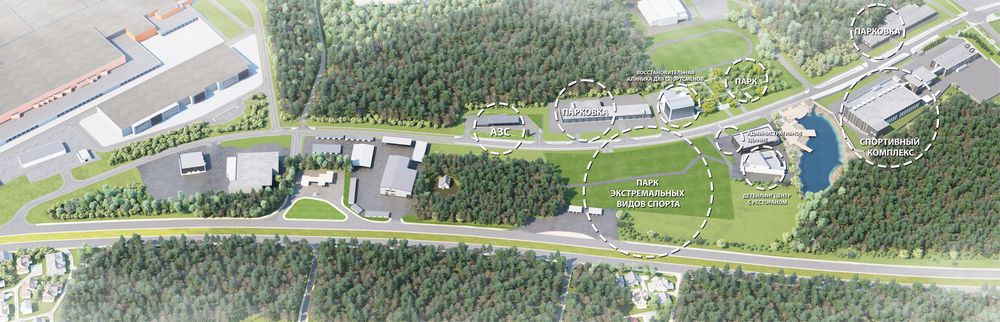 Далее вдоль улицы Архангел Михаил расположен Autolab by RCC – детейлинг центр, автомойка с административным зданием и ресторан NEONI с террасами на крыше. Через дорогу от этих объектов завершаются работы по организации современной АЗС, которая будет оснащена зарядными станциями для электрокаров.