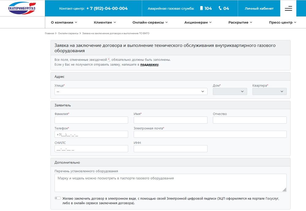 Чтобы подать заявку на заключение договора, необходимо заполнить электронную форму на официальном сайте АО "Екатеринбурггаз".