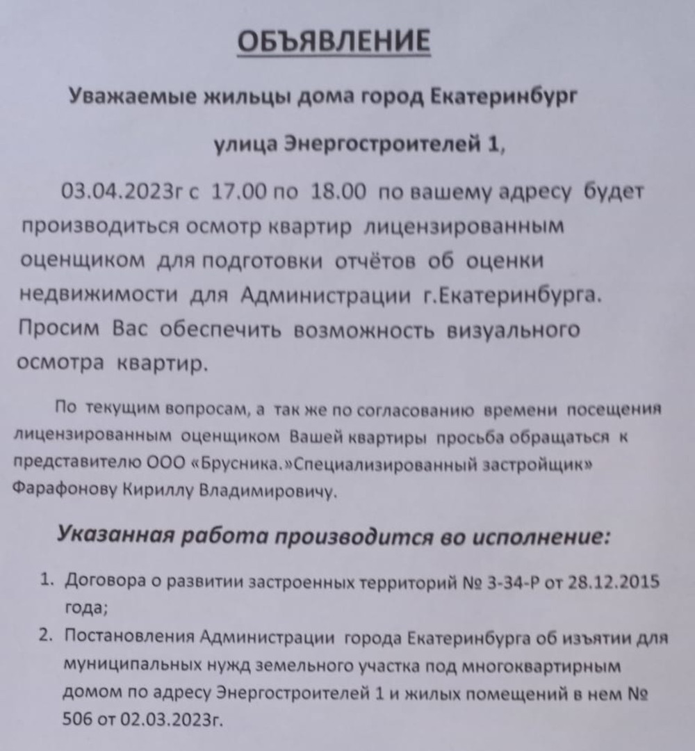 В подтверждение своих слов собеседники агентства представили сканы агентского договора между Фарафоновым и "Брусникой", а также объявления, размещенного в апреле 2023 года на двери их подъезда (оба документа есть в распоряжении "Уралинформбюро"). В частности, в объявлении предприниматель назван "представителем ООО "Брусника. Специализированный застройщик".