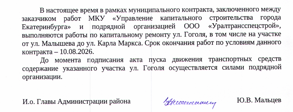 Капитальный ремонт участка улицы Гоголя от Малышева до Куйбышева за почти 1 миллиард рублей начался весной 2024 года и завершится лишь 10 августа 2026 года. Это значит, что тех же дипломатов ждут две тяжелые зимы на ремонтируемой улице, когда ее будут засыпать снегопады, а муниципальные службы будут стоять в стороне.