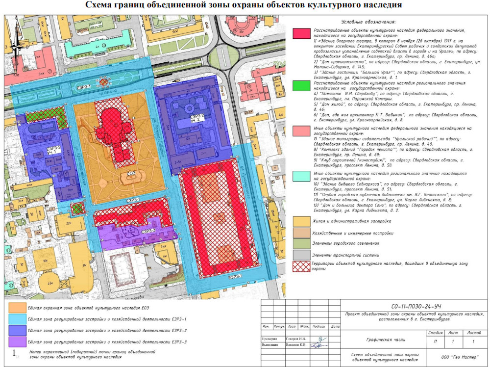 Единая охранная зона (ЕОЗ) устанавливается для территории, где расположены здание Урал Опера Балет, гостиница "Большой Урал", Дом промышленности (главный офис НПО автоматики), памятник Якову Свердлову, жилой дом на Ленина, 46 и Дом, где жил архитектор К. Т. Бабыкин (Красноармейская, 8).